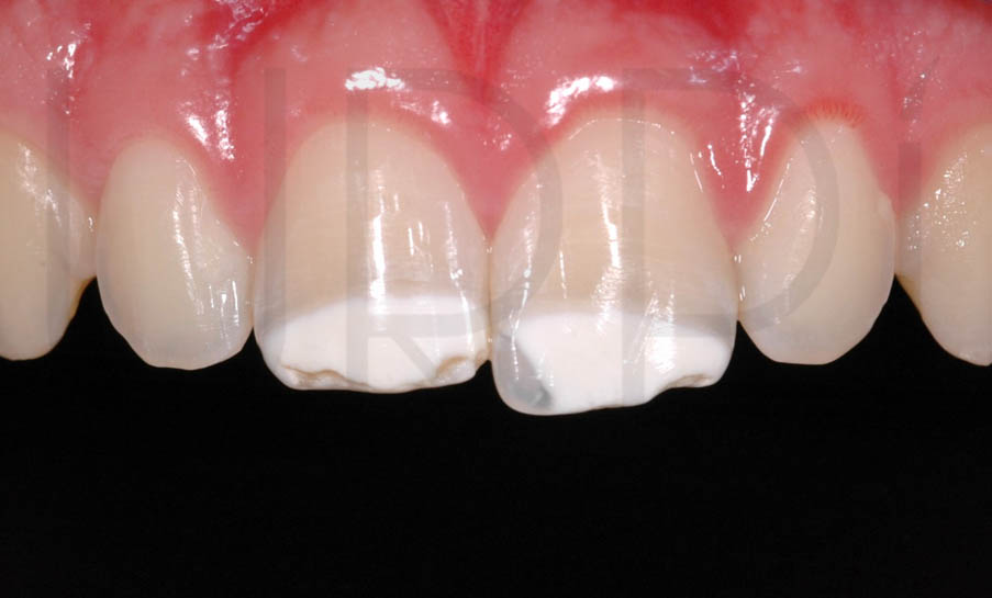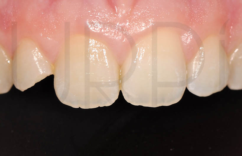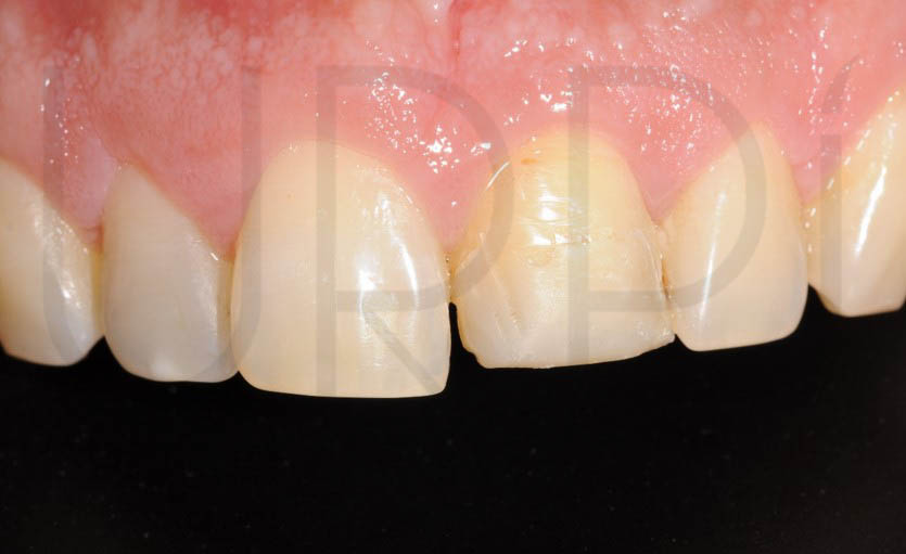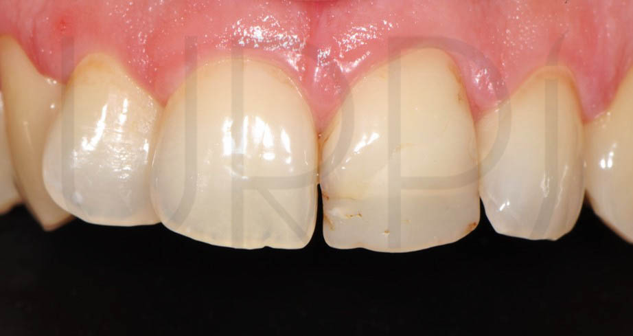 Laminat en incisiva central superior amb decoloració i un compòsit antic defectuós.